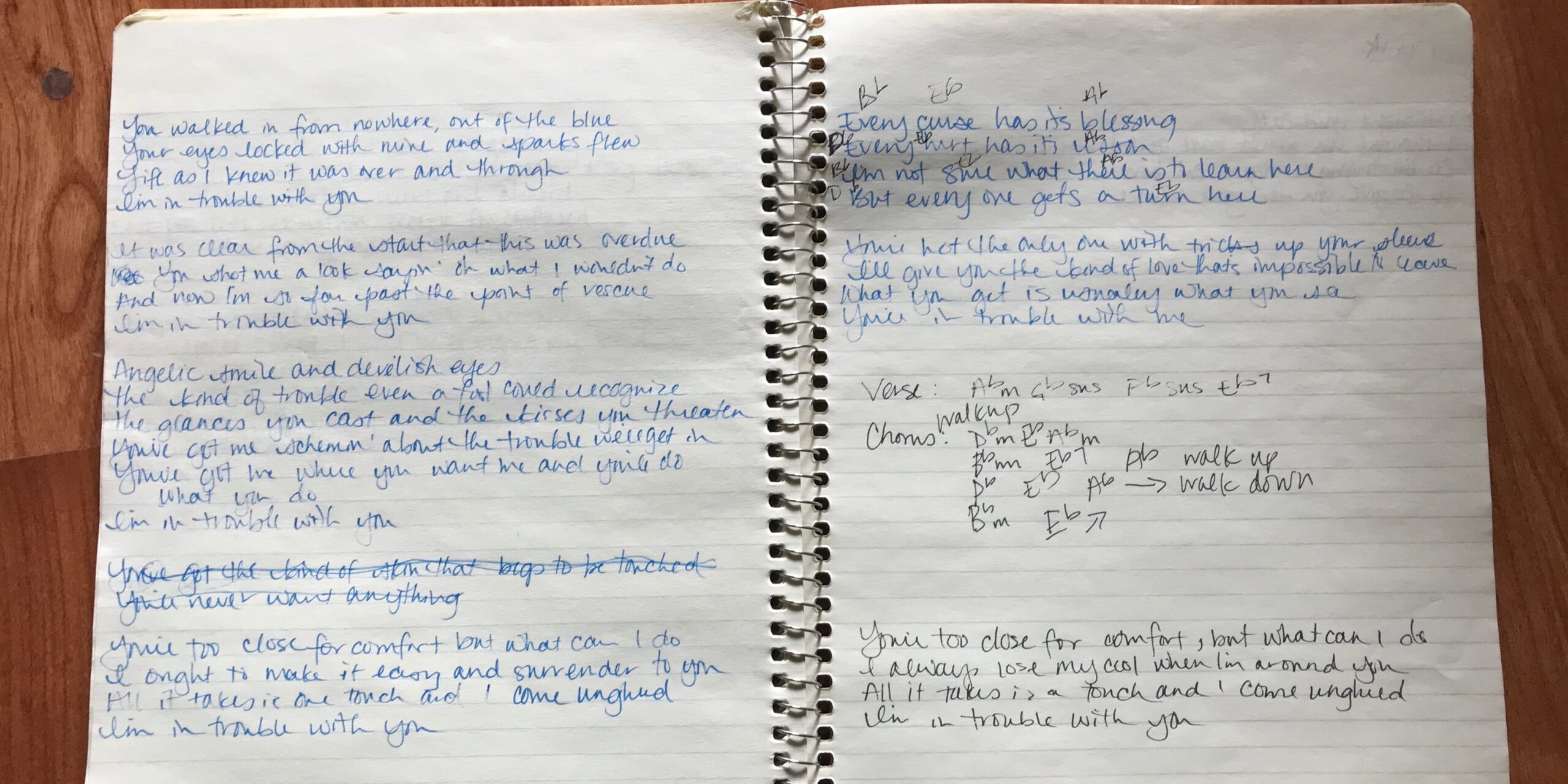 So I wrote a little bit of “Trouble,” maybe the opening ideas first? I can’t remember, and I didn’t date my songbook. I did a few lines at a time, and kind of chipped away at it. Another facet to my practice was to mimic songwriting styles and vocal styles. For example, I’d listen to a song by Jill Barber (please check her out if you haven’t– she’s amazing!) and start to dissect each element of the song, from the lyrics to the harmonies to the instrumentation, feel, and how effective those individual elements were in conveying what I thought was the message of the song. I was also listening to a lot of Norah Jones, and I really appreciated how she could be sultry and sexy, but could also be down to earth and elegant at the same time. Once I would dissect an entire song, I would try to build a new one that was like it, but different enough to be mine. This is, essentially, how “Trouble” came about. I was trying to mimic Jill Barber and Norah Jones, and playing with the sultrier sides of my voice and singing style, to see what kinds of boundaries existed for me on that front. In my mind, I was writing a “Hypothetical Seduction Song,” and I think I achieved that.